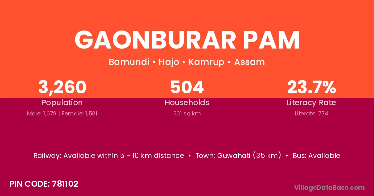 Guwahati (35 km) is the nearest town to Gaonburar Pam village for major economic activities and is located approximately 35 km away.