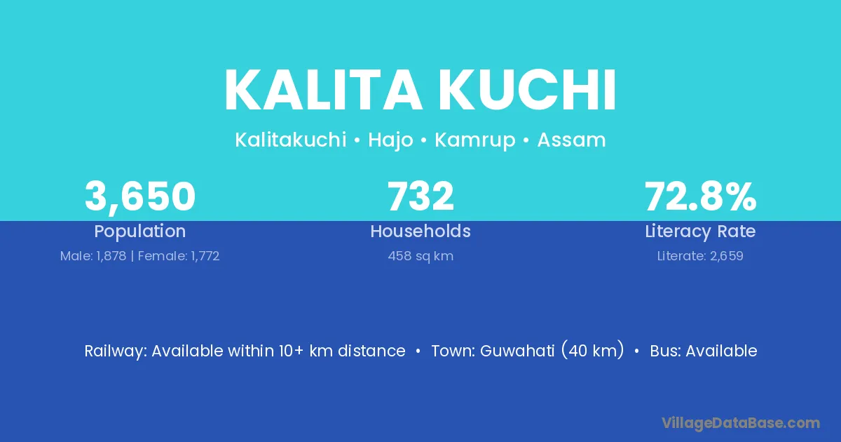Guwahati (40 km) is the nearest town to Kalita Kuchi village for major economic activities and is located approximately 40 km away.