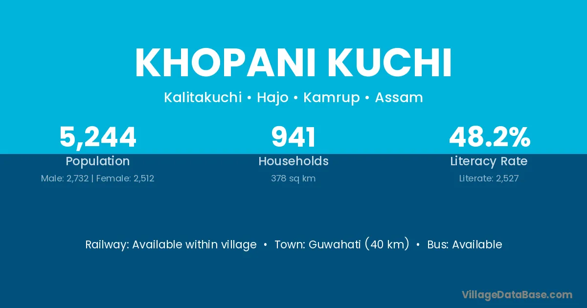 Guwahati (40 km) is the nearest town to Khopani Kuchi village for major economic activities and is located approximately 40 km away.