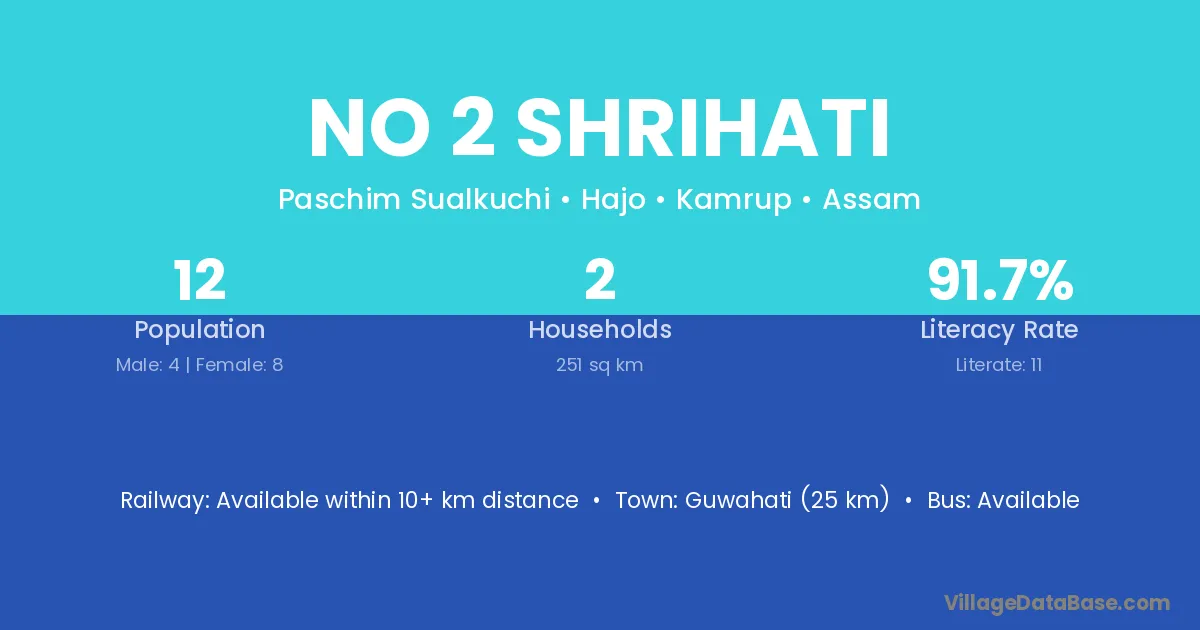 Guwahati (25 km) is the nearest town to No 2 Shrihati village for major economic activities and is located approximately 25 km away.