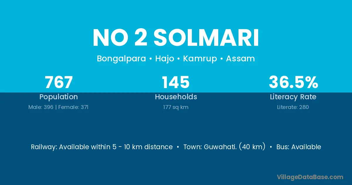 Guwahati. (40 km) is the nearest town to No 2 Solmari village for major economic activities and is located approximately 40 km away.