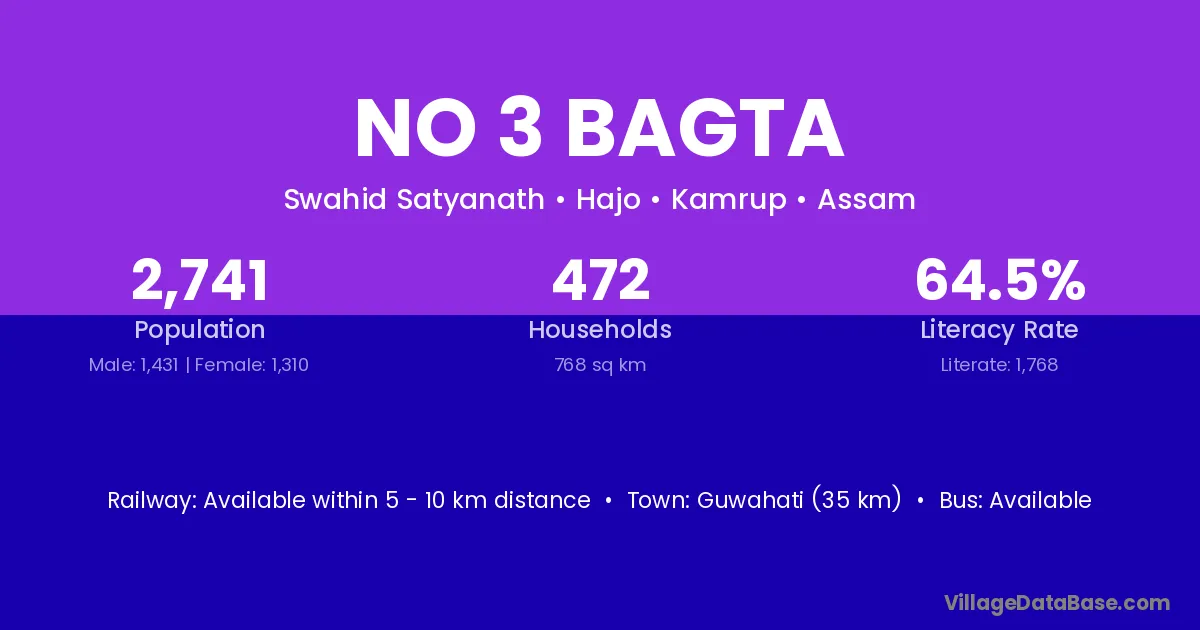 Guwahati (35 km) is the nearest town to No 3 Bagta village for major economic activities and is located approximately 35 km away.