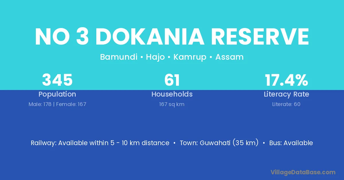 Guwahati (35 km) is the nearest town to No 3 Dokania Reserve village for major economic activities and is located approximately 35 km away.