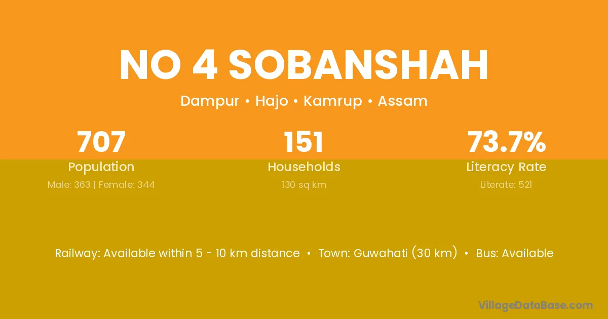 Guwahati (30 km) is the nearest town to No 4 Sobanshah village for major economic activities and is located approximately 30 km away.