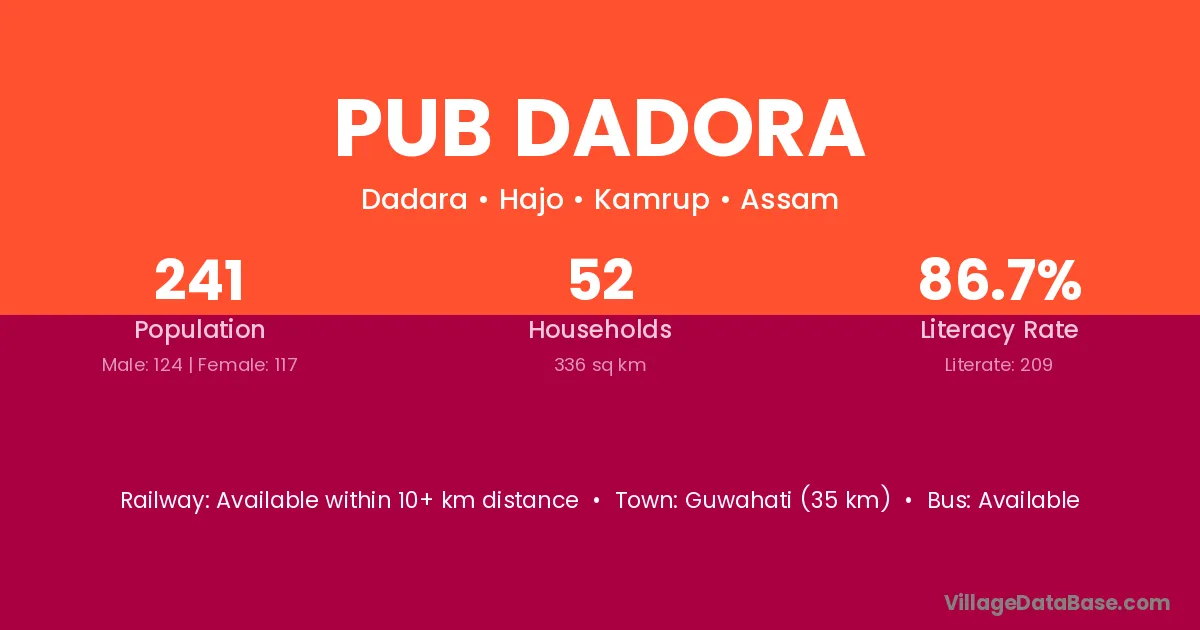 Guwahati (35 km) is the nearest town to Pub Dadora village for major economic activities and is located approximately 35 km away.