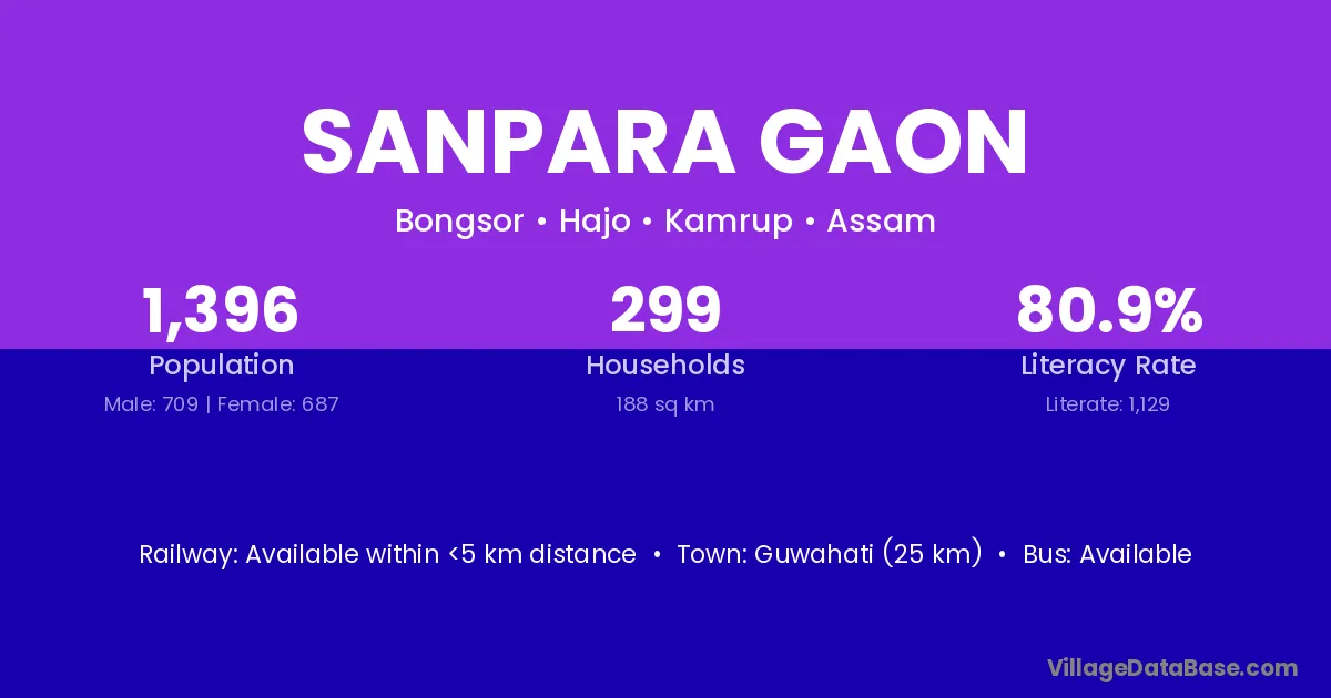 Guwahati (25 km) is the nearest town to Sanpara Gaon village for major economic activities and is located approximately 25 km away.