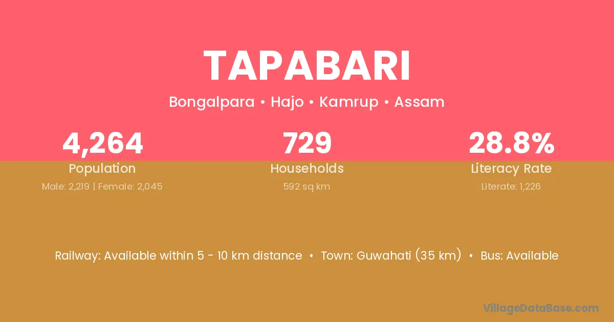 Guwahati (35 km) is the nearest town to Tapabari village for major economic activities and is located approximately 35 km away.
