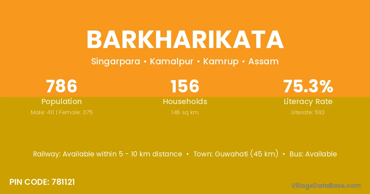 Guwahati (45 km) is the nearest town to Barkharikata village for major economic activities and is located approximately 45 km away.