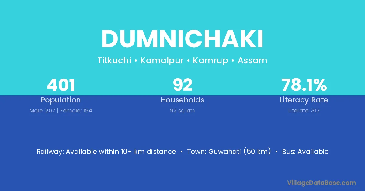Guwahati (50 km) is the nearest town to Dumnichaki village for major economic activities and is located approximately 50 km away.