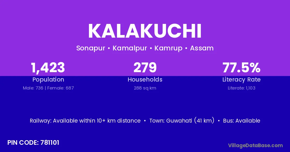 Guwahati (41 km) is the nearest town to Kalakuchi village for major economic activities and is located approximately 41 km away.