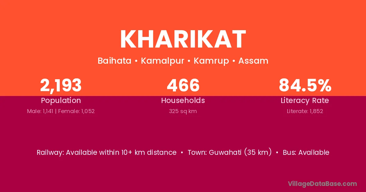 Guwahati (35 km) is the nearest town to Kharikat village for major economic activities and is located approximately 35 km away.