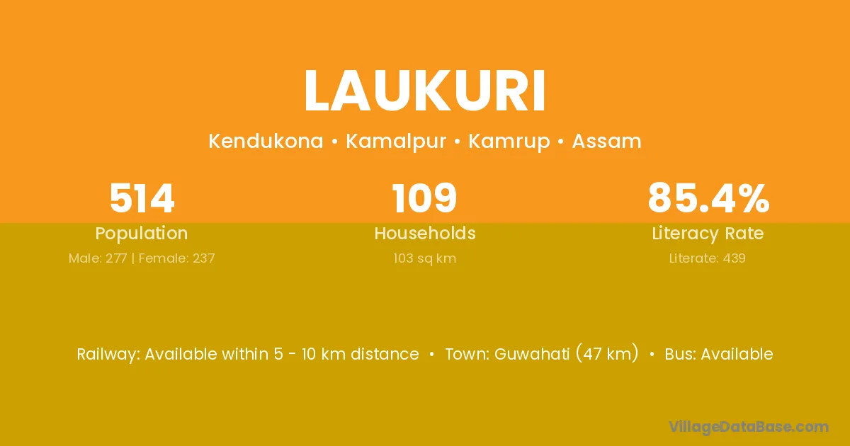 Guwahati (47 km) is the nearest town to Laukuri village for major economic activities and is located approximately 47 km away.