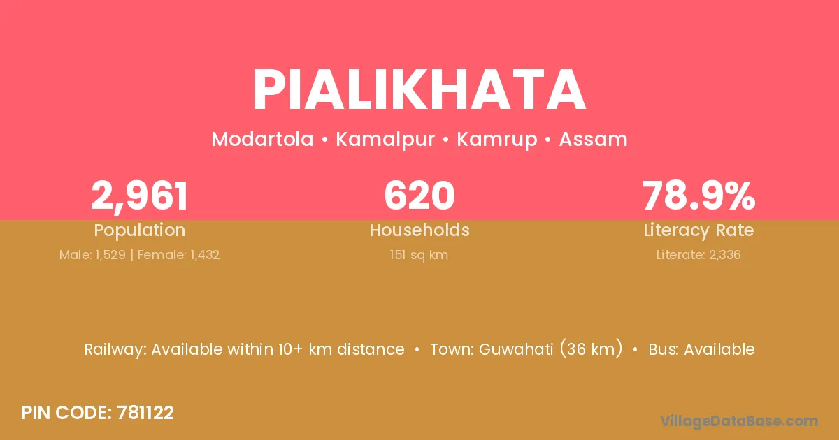 Guwahati (36 km) is the nearest town to Pialikhata village for major economic activities and is located approximately 36 km away.