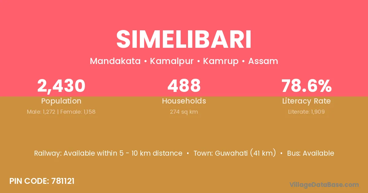 Guwahati (41 km) is the nearest town to Simelibari village for major economic activities and is located approximately 41 km away.