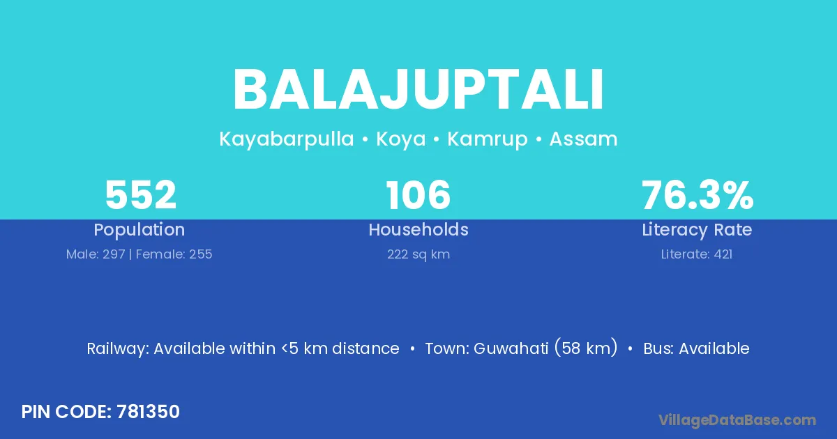 Guwahati (58 km) is the nearest town to Balajuptali village for major economic activities and is located approximately 58 km away.