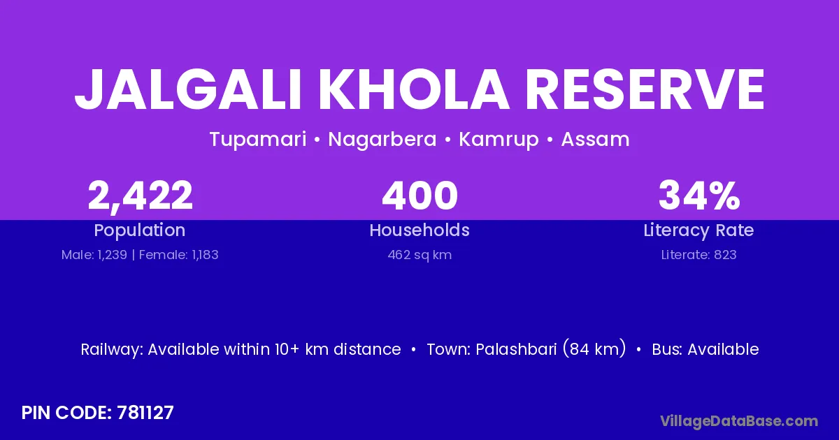 Palashbari (84 km) is the nearest town to Jalgali Khola Reserve village for major economic activities and is located approximately 84 km away.
