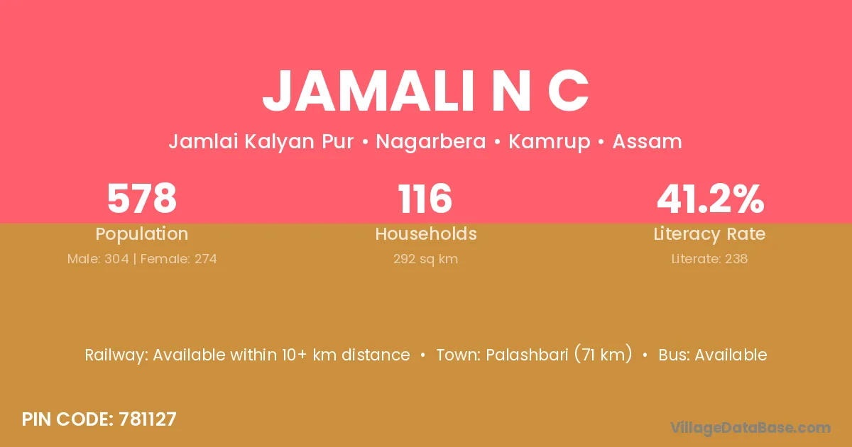 Palashbari (71 km) is the nearest town to Jamali N C village for major economic activities and is located approximately 71 km away.