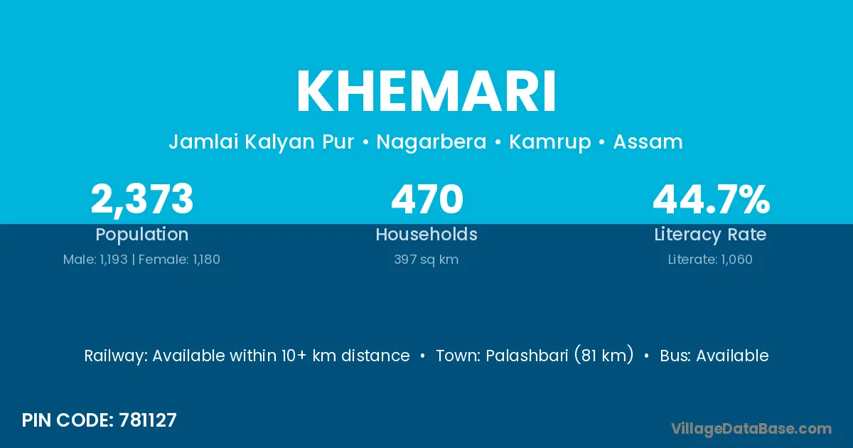 Palashbari (81 km) is the nearest town to Khemari village for major economic activities and is located approximately 81 km away.