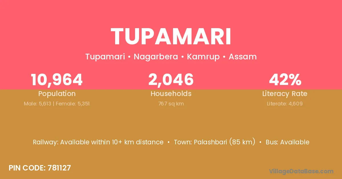 Palashbari (85 km) is the nearest town to Tupamari village for major economic activities and is located approximately 85 km away.