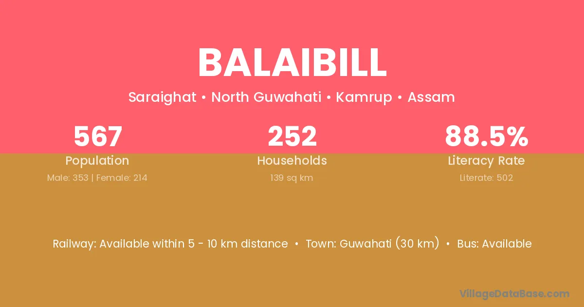 Guwahati (30 km) is the nearest town to Balaibill village for major economic activities and is located approximately 30 km away.