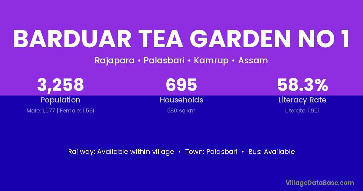 Barduar Tea Garden No 1 village has a total population of 3,258 people, of which 1,677 are males and 1,581 are females.
