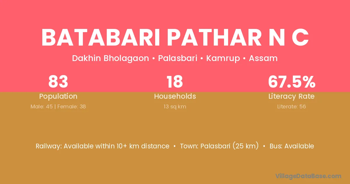 Batabari Pathar N C village has a total population of 83 people, of which 45 are males and 38 are females.