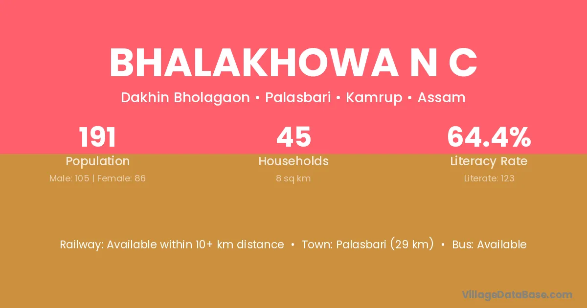 Palasbari (29 km) is the nearest town to Bhalakhowa N C village for major economic activities and is located approximately 29 km away.