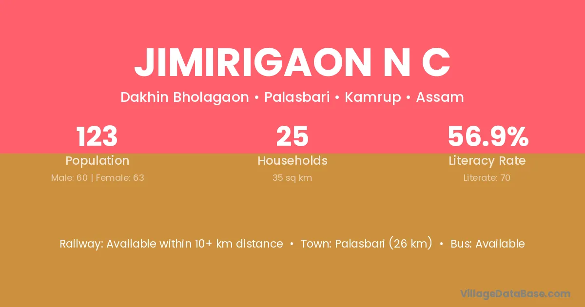 Jimirigaon N C village has a total population of 123 people, of which 60 are males and 63 are females.