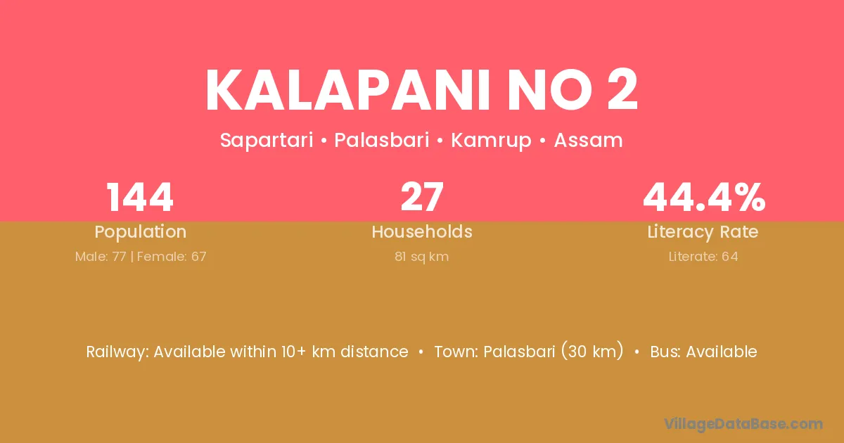 Palasbari (30 km) is the nearest town to Kalapani No 2 village for major economic activities and is located approximately 30 km away.