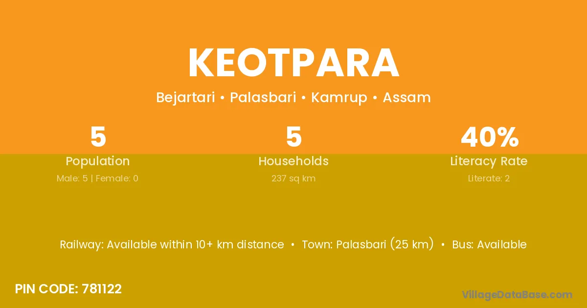 Palasbari (25 km) is the nearest town to Keotpara village for major economic activities and is located approximately 25 km away.