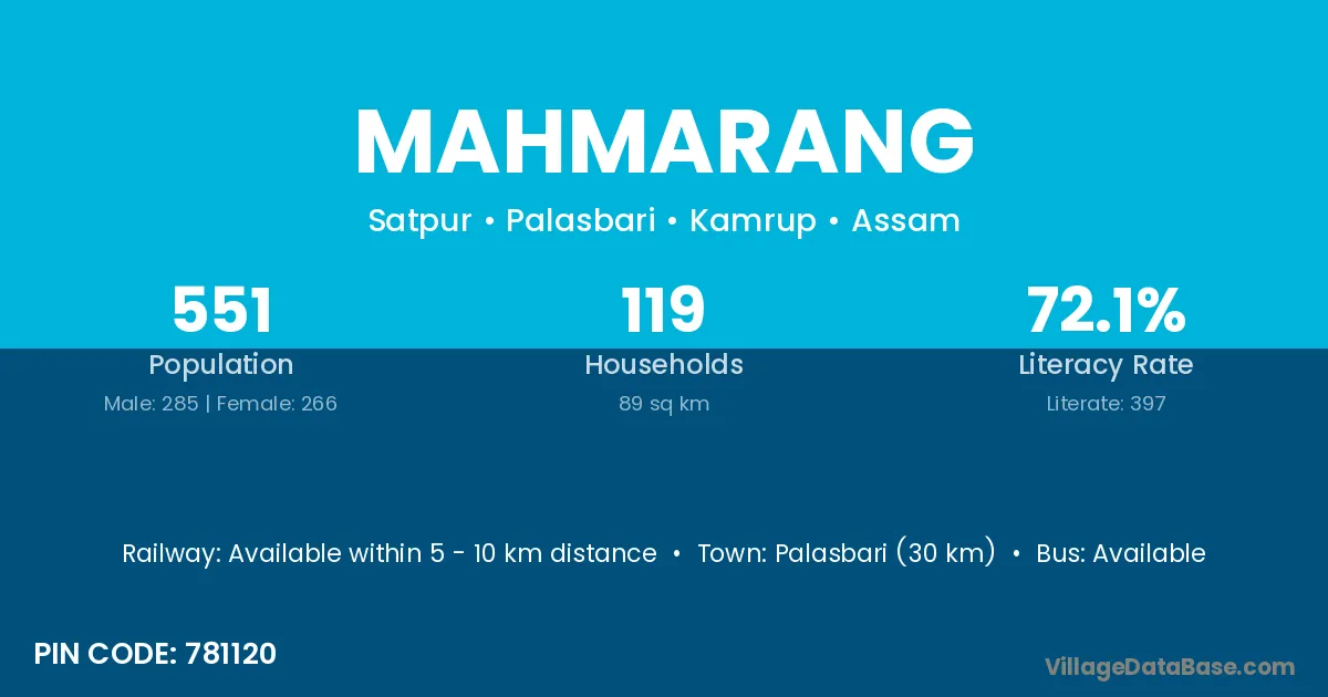 Palasbari (30 km) is the nearest town to Mahmarang village for major economic activities and is located approximately 30 km away.