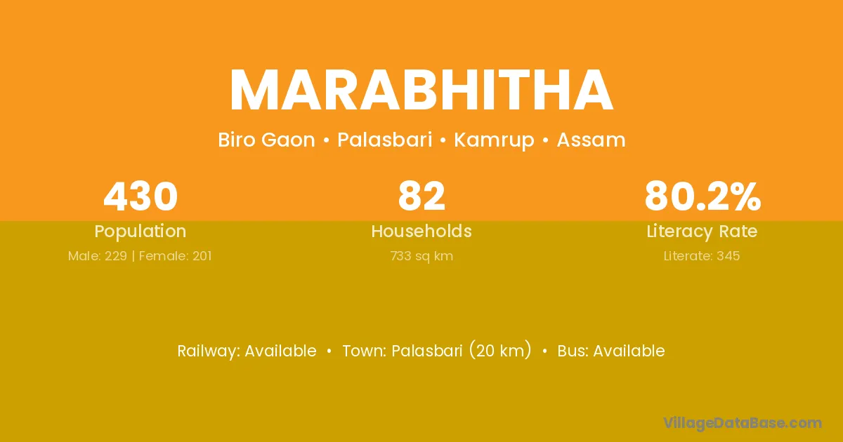 Palasbari (20 km) is the nearest town to Marabhitha village for major economic activities and is located approximately 20 km away.