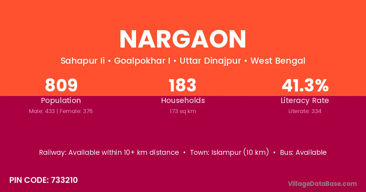 Guwahati (28 km) is the nearest town to Nargaon village for major economic activities and is located approximately 28 km away.