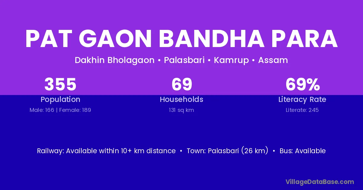 Palasbari (26 km) is the nearest town to Pat Gaon Bandha Para village for major economic activities and is located approximately 26 km away.