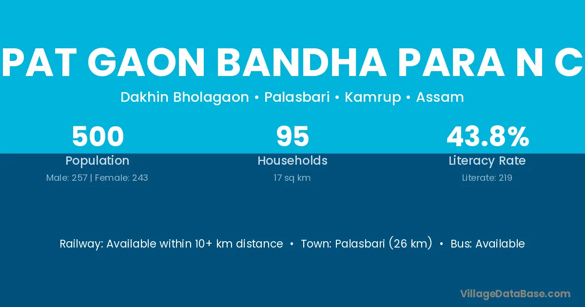 Palasbari (26 km) is the nearest town to Pat Gaon Bandha Para N C village for major economic activities and is located approximately 26 km away.