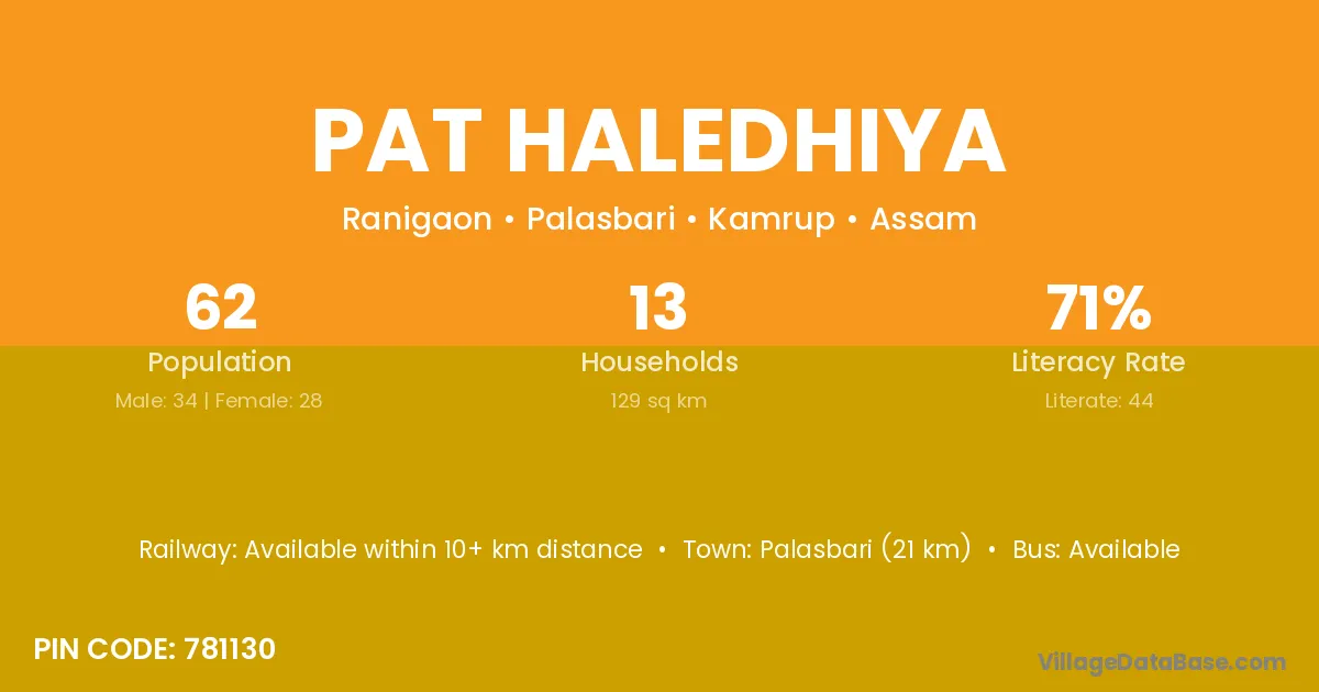 Palasbari (21 km) is the nearest town to Pat Haledhiya village for major economic activities and is located approximately 21 km away.