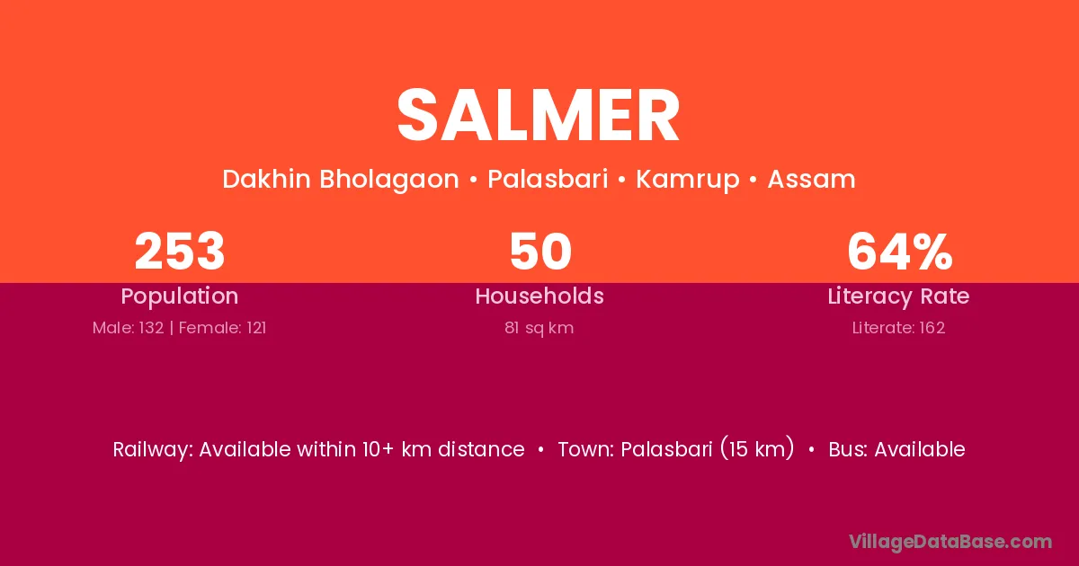 Palasbari (15 km) is the nearest town to Salmer village for major economic activities and is located approximately 15 km away.