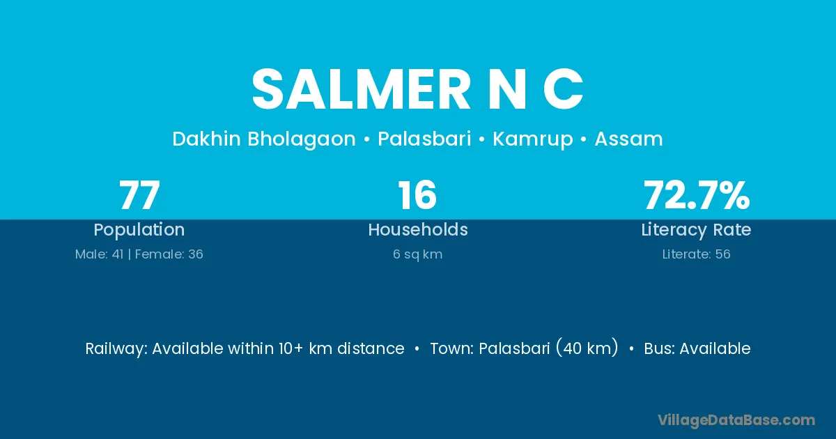 Palasbari (40 km) is the nearest town to Salmer N C village for major economic activities and is located approximately 40 km away.
