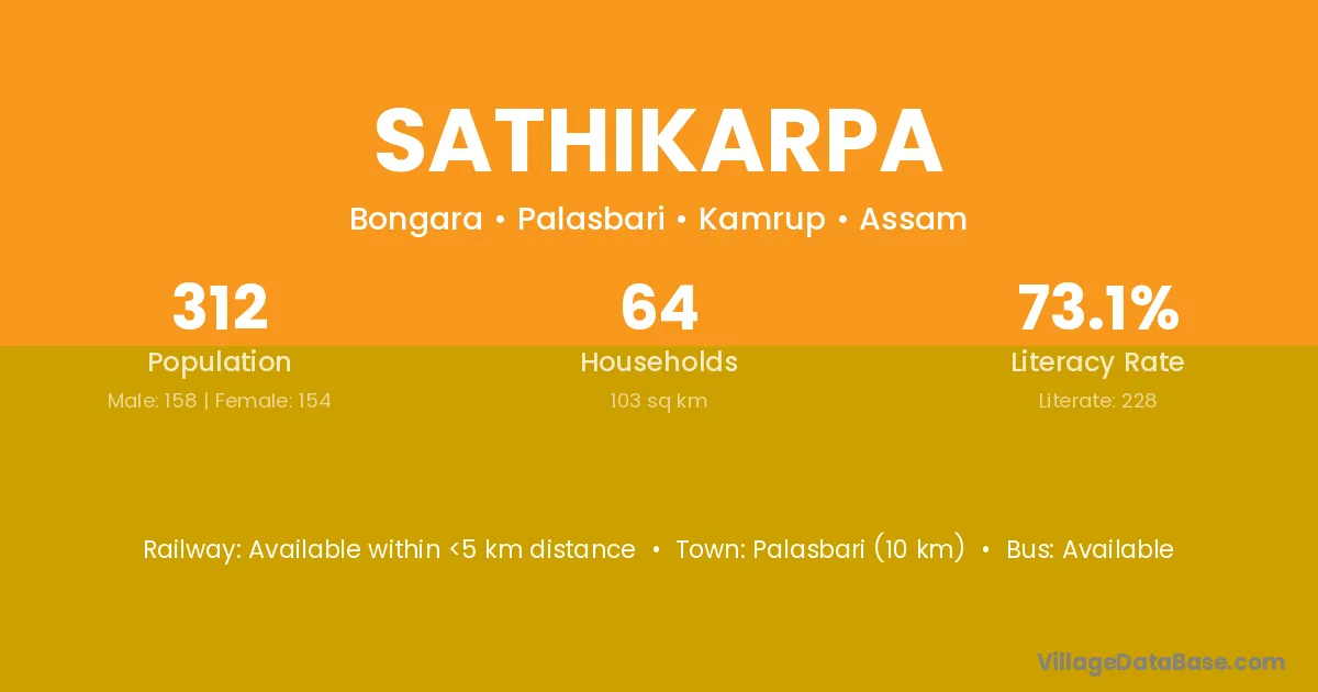 Palasbari (10 km) is the nearest town to Sathikarpa village for major economic activities and is located approximately 10 km away.