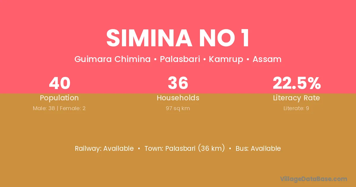 Palasbari (36 km) is the nearest town to Simina No 1 village for major economic activities and is located approximately 36 km away.