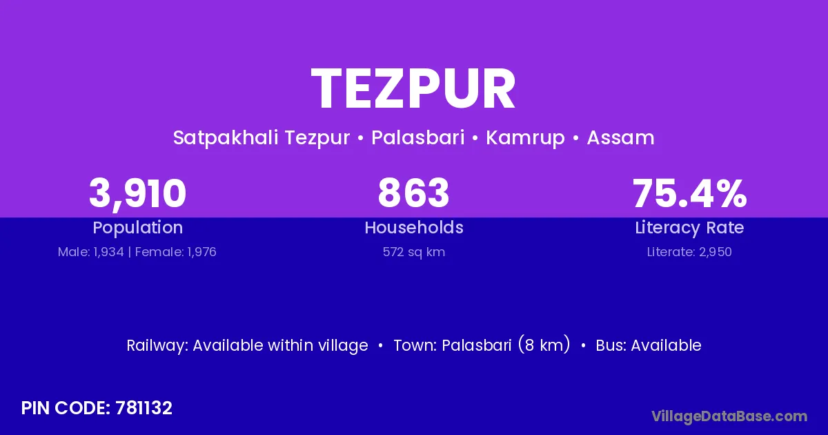 Palasbari (8 km) is the nearest town to Tezpur village for major economic activities and is located approximately 8 km away.
