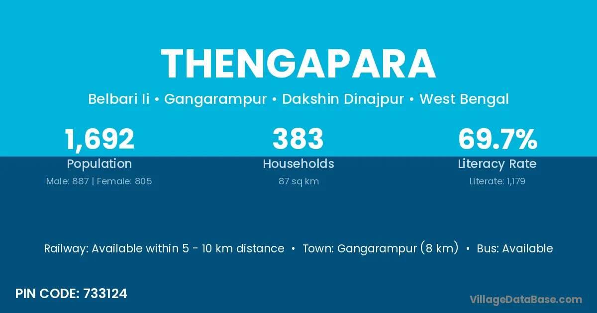 Palasbari (13 km) is the nearest town to Thengapara village for major economic activities and is located approximately 13 km away.