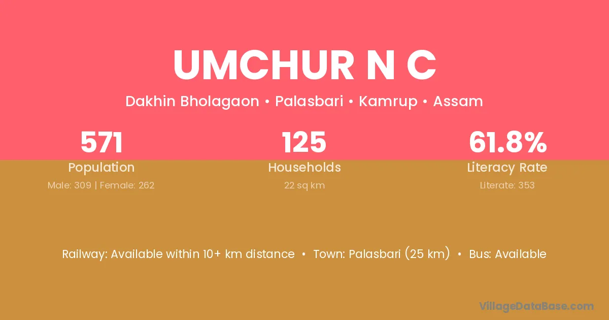 Palasbari (25 km) is the nearest town to Umchur N C village for major economic activities and is located approximately 25 km away.