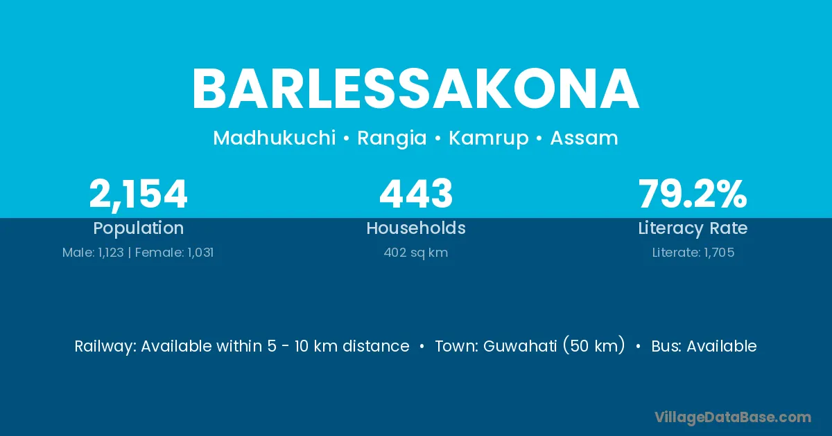 Guwahati (50 km) is the nearest town to Barlessakona village for major economic activities and is located approximately 50 km away.