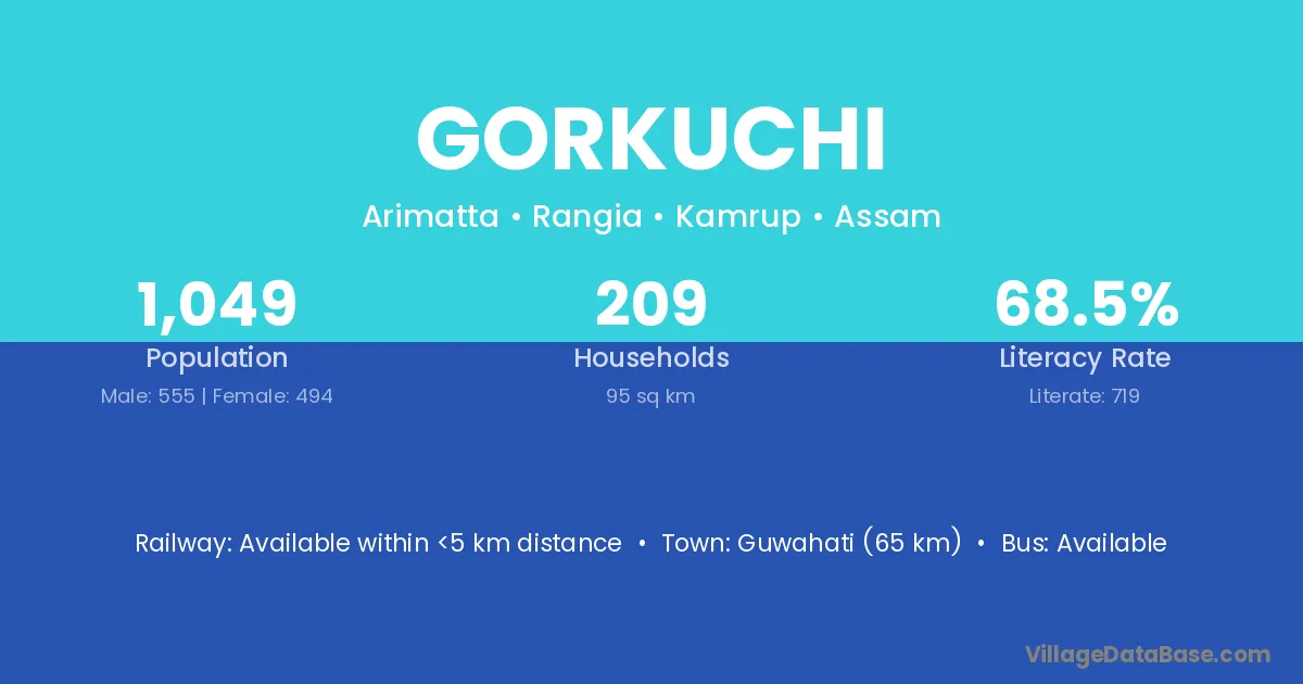 Guwahati (65 km) is the nearest town to Gorkuchi village for major economic activities and is located approximately 65 km away.