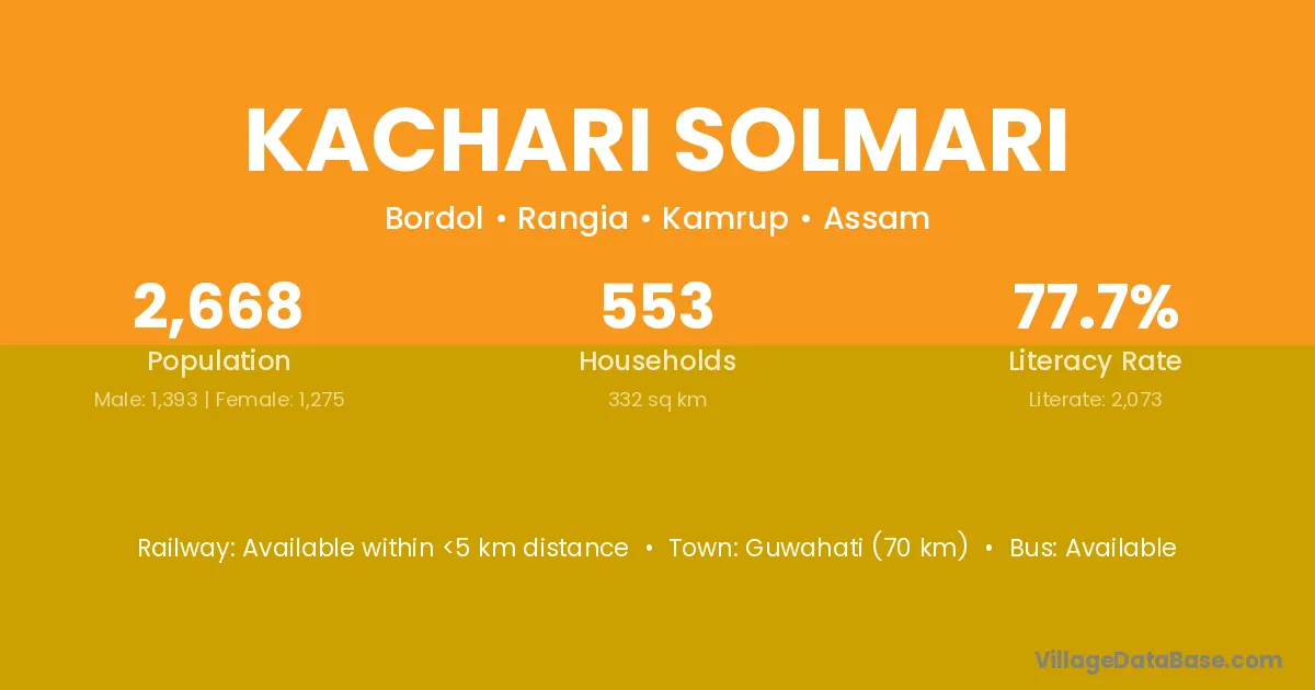Guwahati (70 km) is the nearest town to Kachari Solmari village for major economic activities and is located approximately 70 km away.