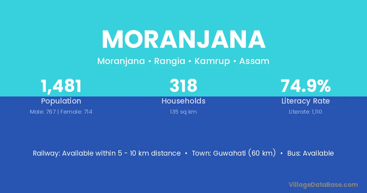 Guwahati (60 km) is the nearest town to Moranjana village for major economic activities and is located approximately 60 km away.