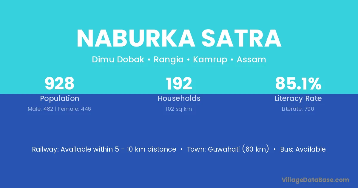 Guwahati (60 km) is the nearest town to Naburka Satra village for major economic activities and is located approximately 60 km away.