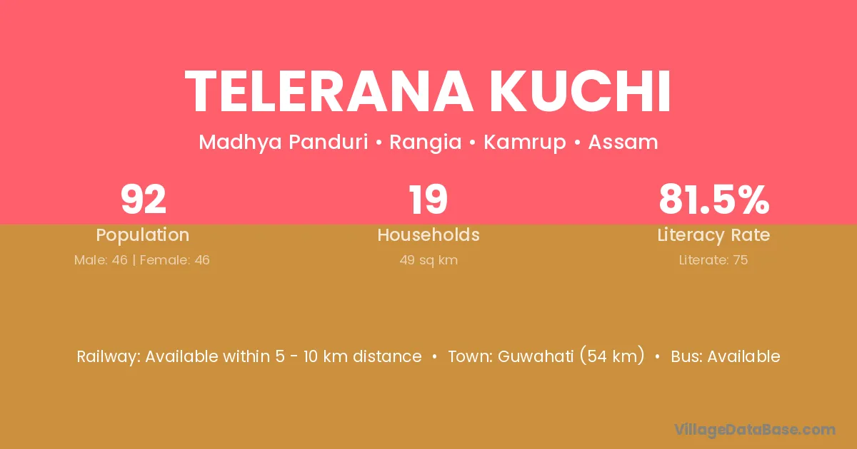 Guwahati (54 km) is the nearest town to Telerana Kuchi village for major economic activities and is located approximately 54 km away.