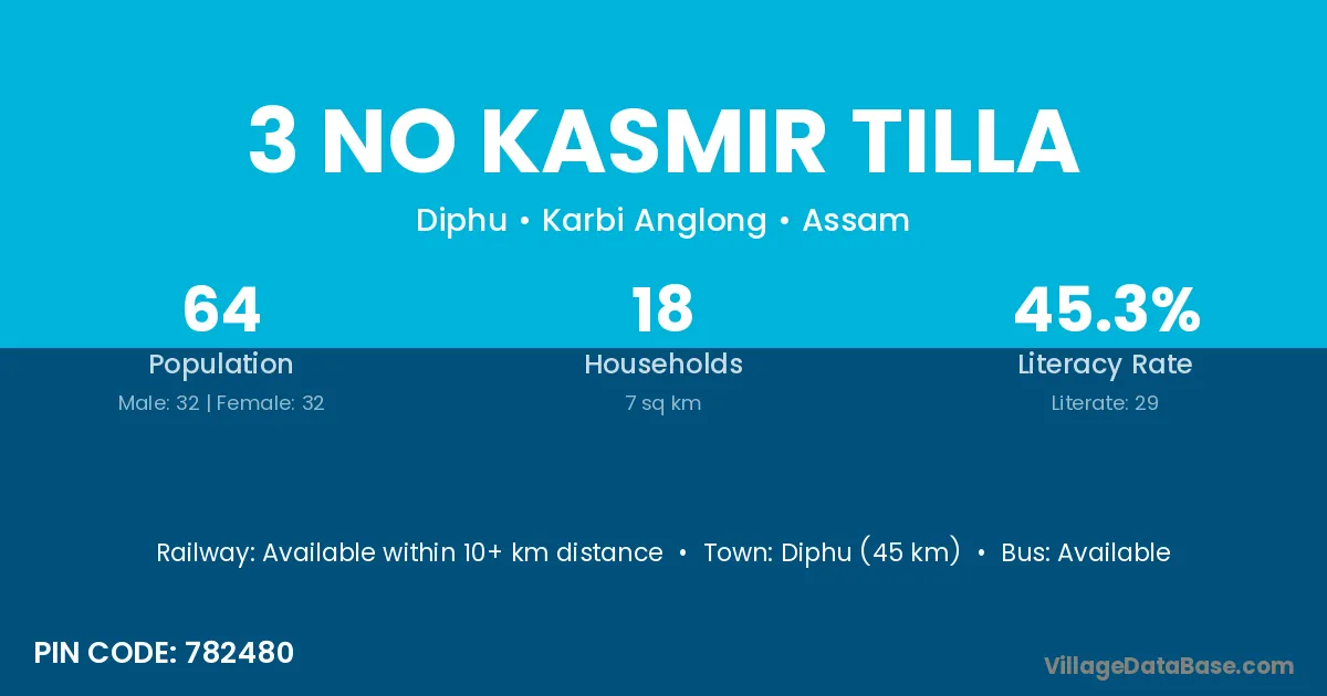 Diphu (45 km) is the nearest town to 3 No Kasmir Tilla village for major economic activities and is located approximately 45 km away.